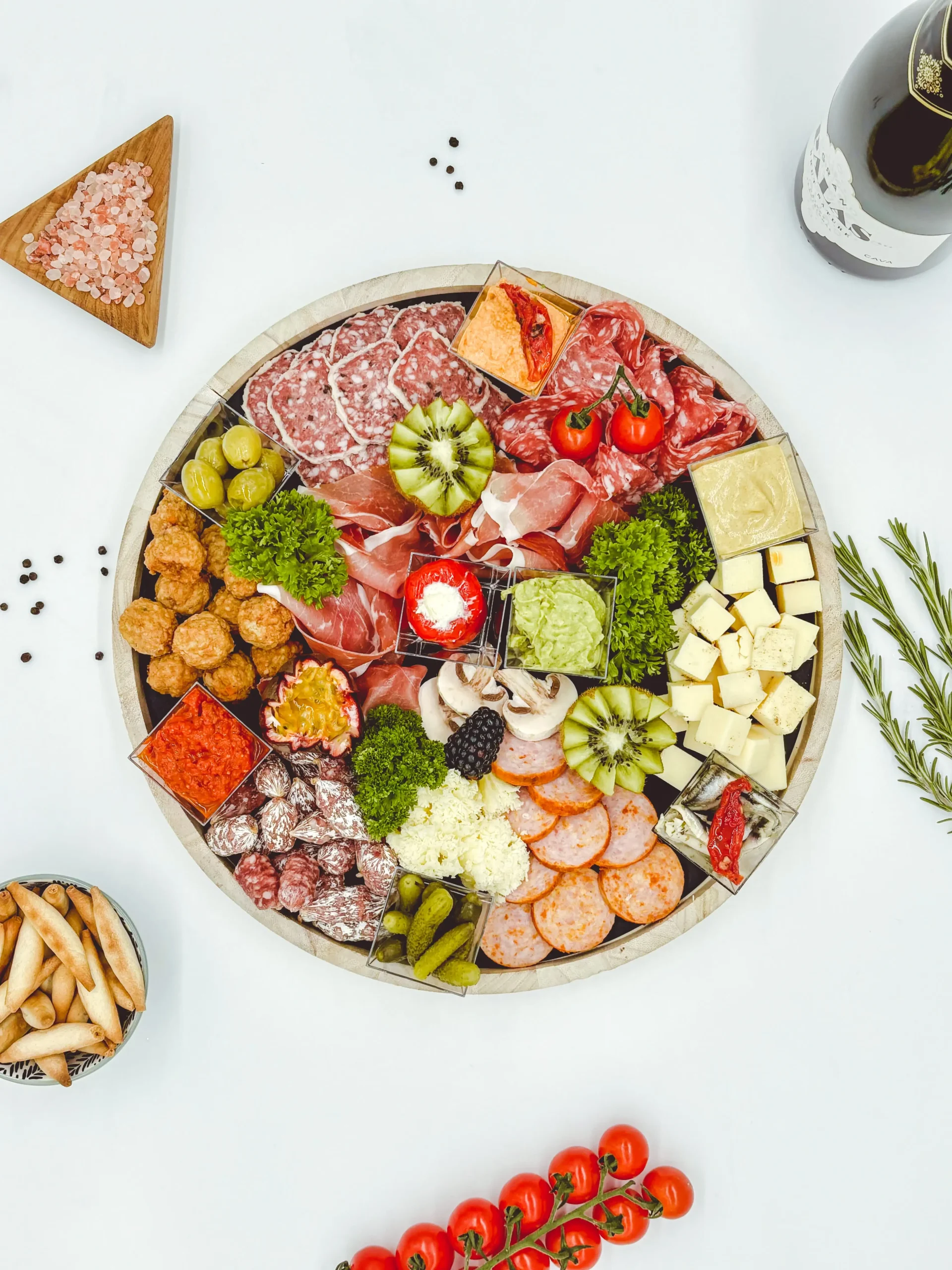 Old amsterdam kaas met mosterd, olijven, augurken, ansjovis, hummus, paprikadip, truffel salami, reserva negroni, serranoham, grillworst, tête de moine (kaas), aperobolletjes, apero salami, paprika gevuld met roomkaas en grissini.