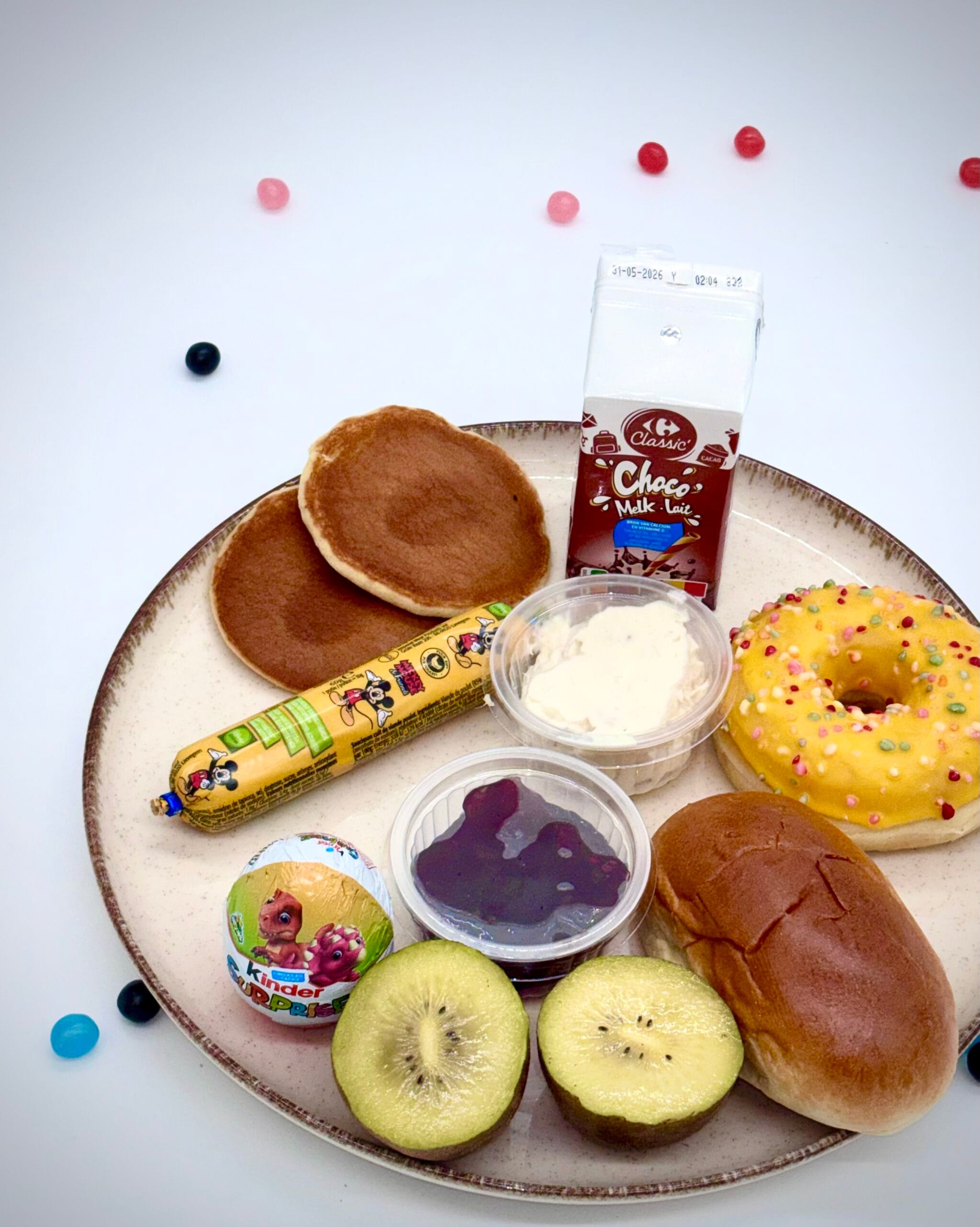 Donut, sandwich, mini pancakes, kipsalade, confituur, surprise ei, mickey worstje, gele kiwi & chocomelk.