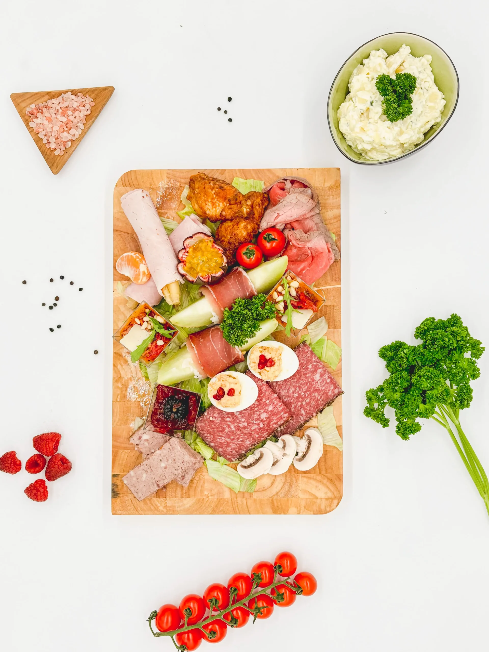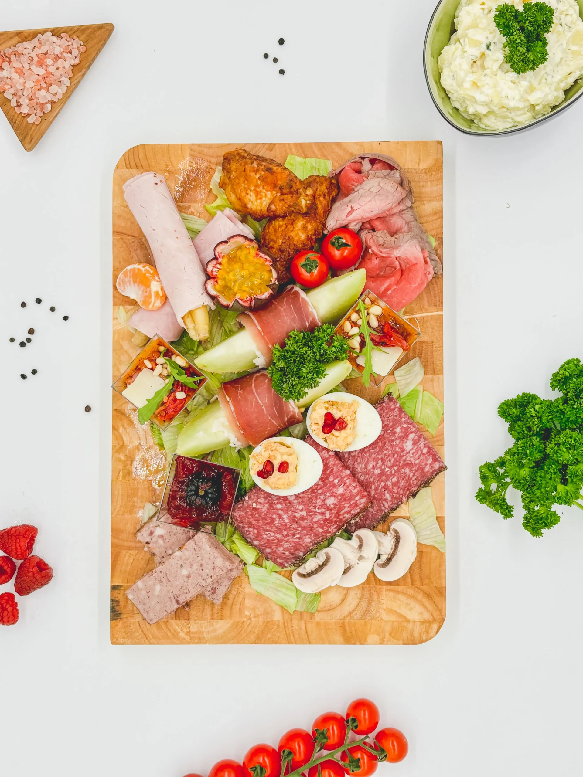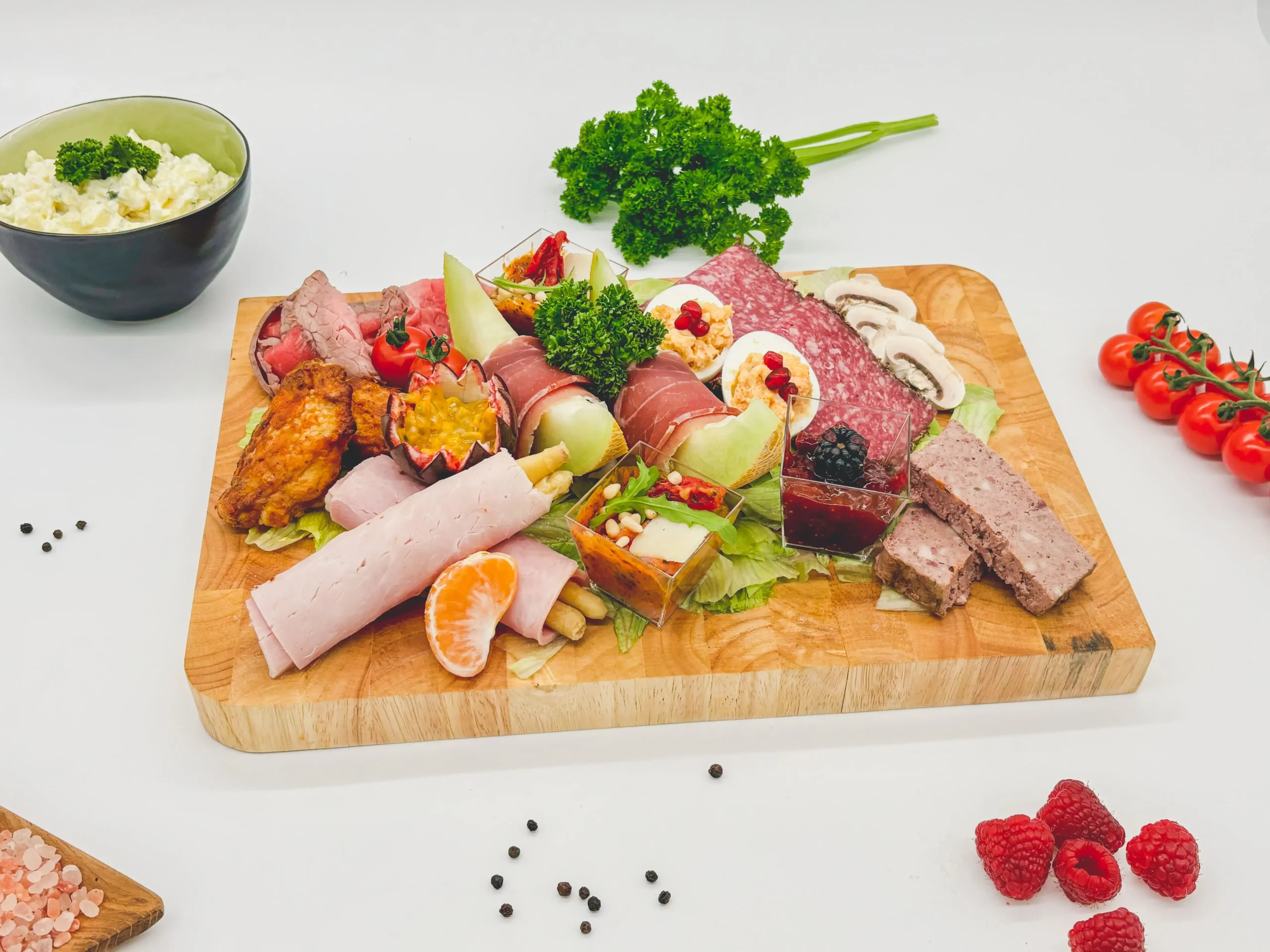 Asperges opgerold in beenhesp, rundscarpaccio, rosbief, seizoenspaté met uienconfijt, meloen met parmaham, opgevuld ei, kippenboutje, spaanse salami. Inclusief koude groenten en aardappelsalade.