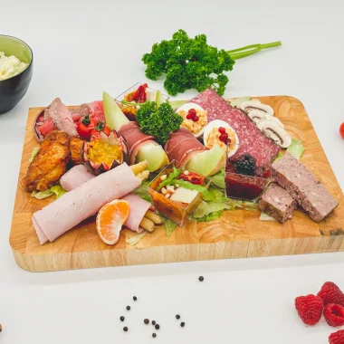Mini berlijnse bol, mini eclair, huisgemaakte broodpudding, bokkenpootjes, mini appelcake, mini frangipane, mini confituurtaartje en fruit.