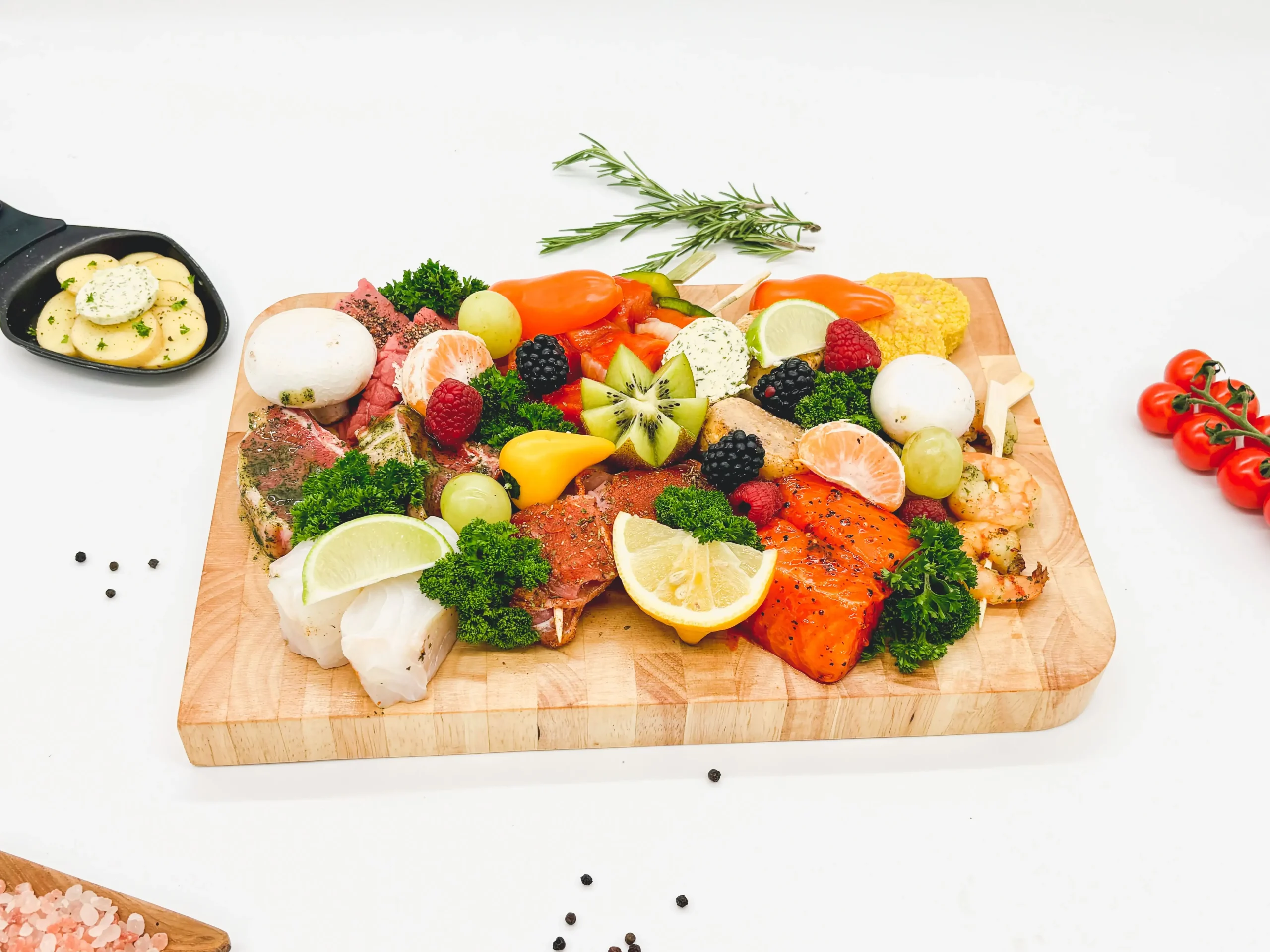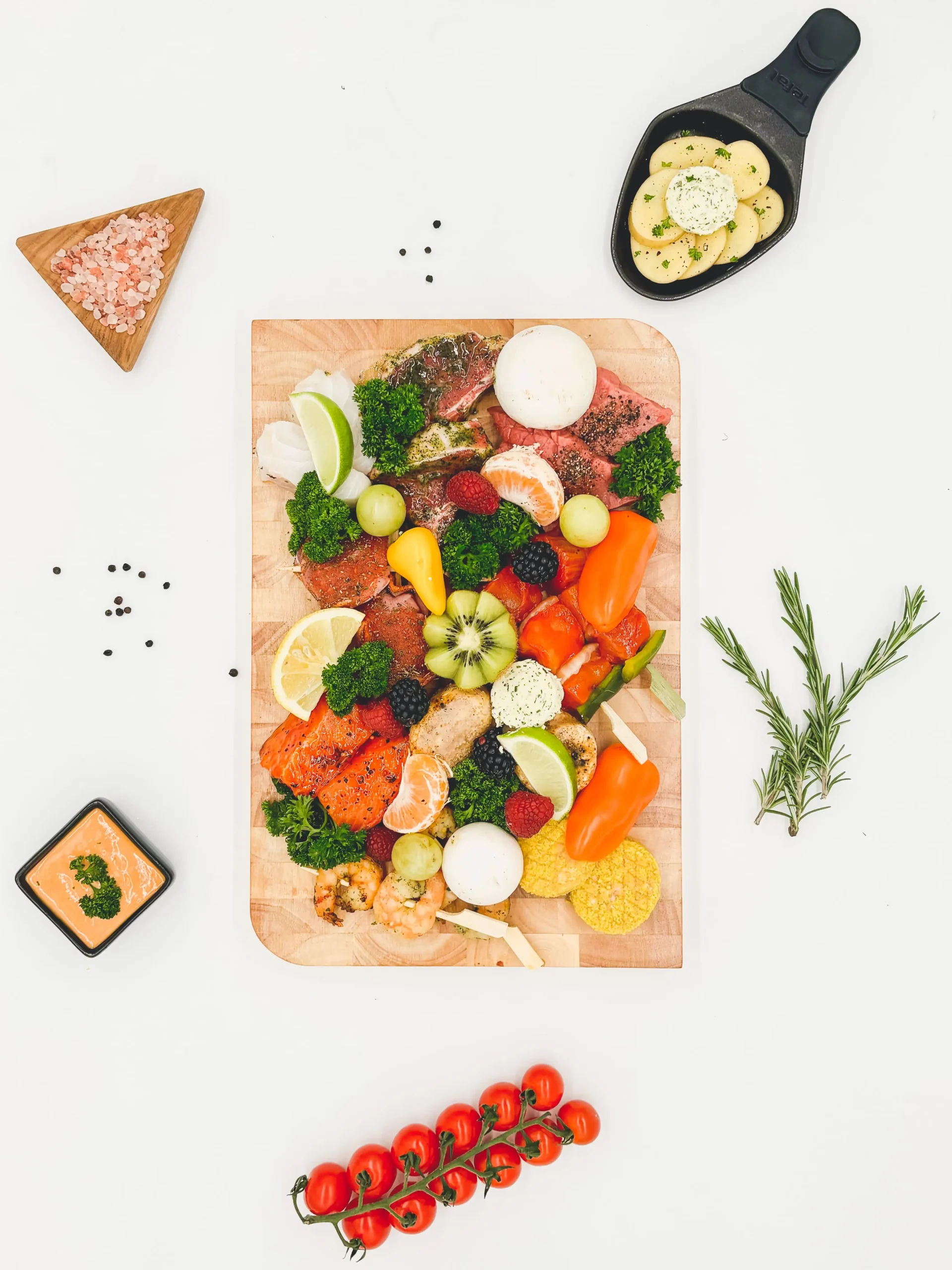 Filet mignon, gemarineerde lamskotelet, varkenshaasje royal, mini burger, kipsaté, scampi brochette, gemarineerde zalm, kabeljauw, coquille.