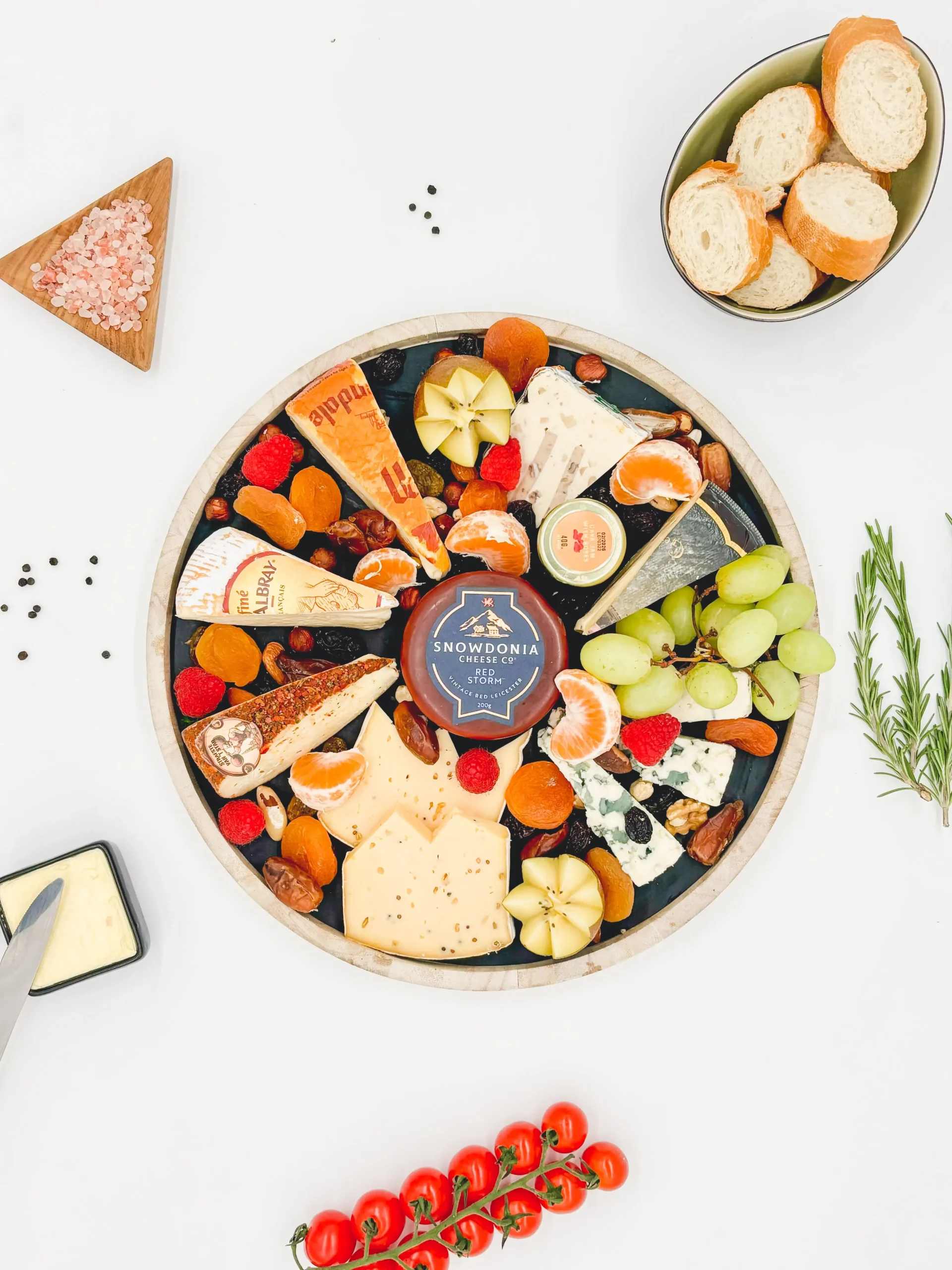 Assortiment van kazen met vers fruit, noten, gedroogde vruchten en confituurtjes.